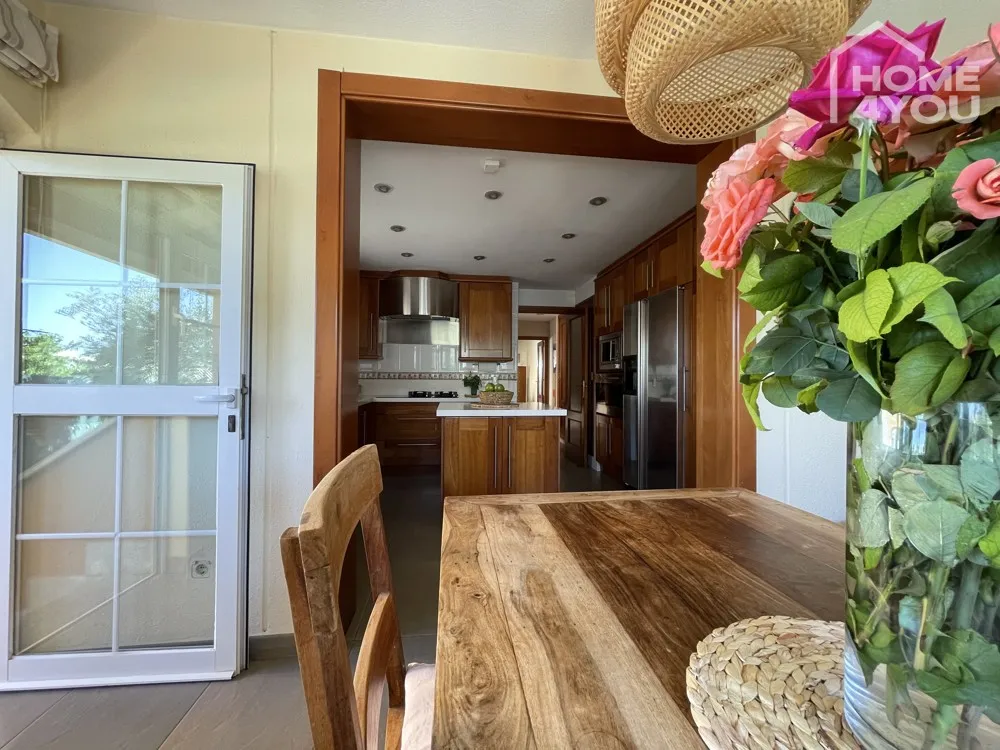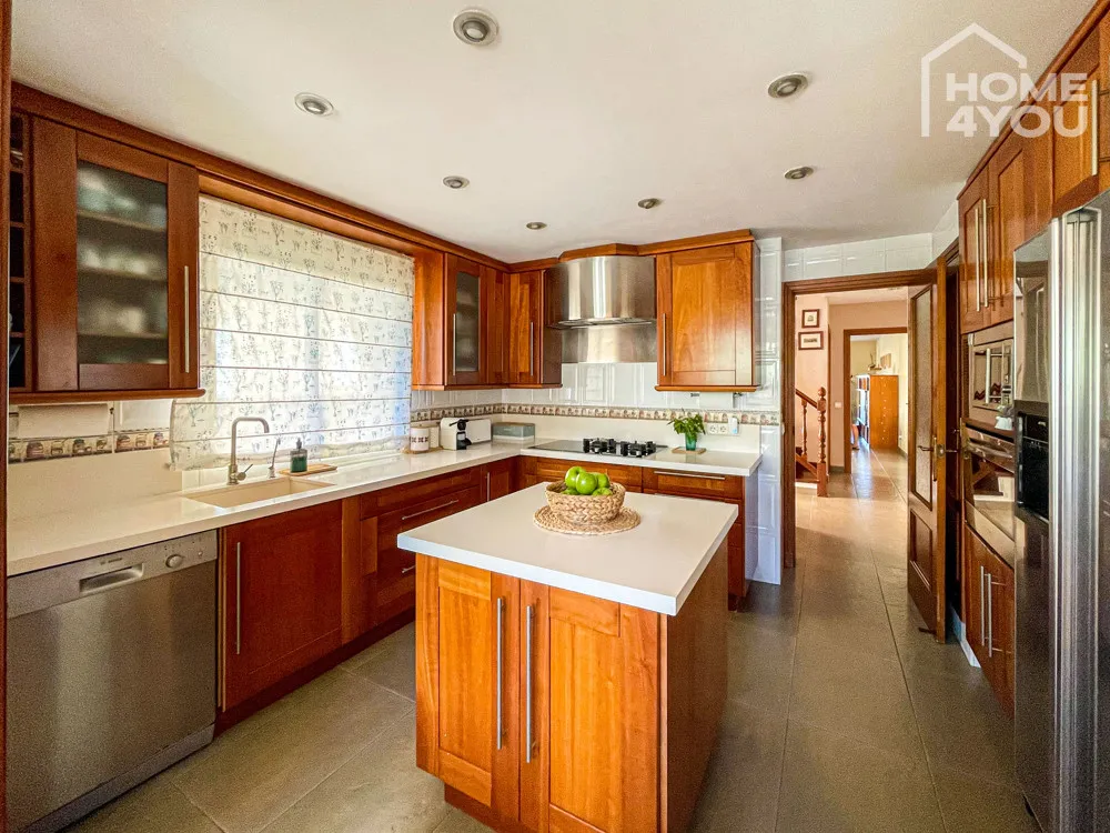 Über eine kleine Treppe erreichen Sie den Essbereich, der an die große Küche angrenzt. Hier gibt es eine sehr moderne Küchen-Einrichtung mit einer Kochinsel in der Mitte, die das Kochen mit Familie und Freunden zu einem Erlebnis werden lässt.
