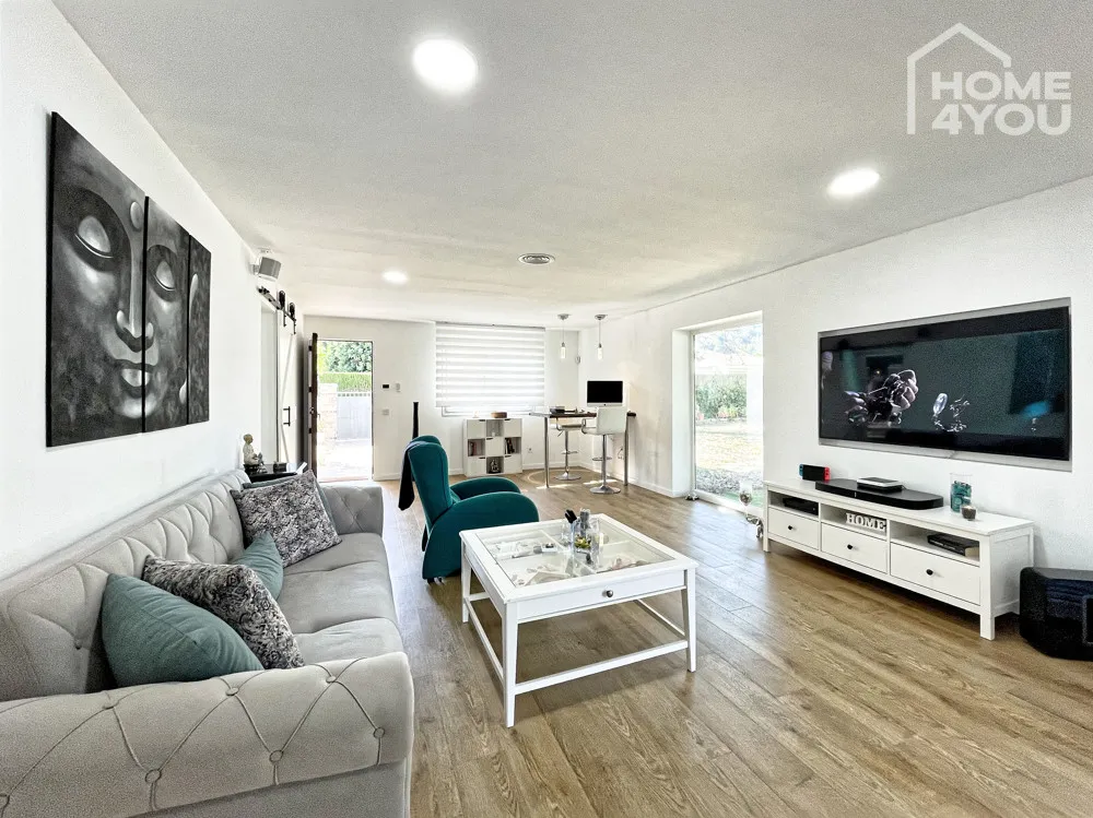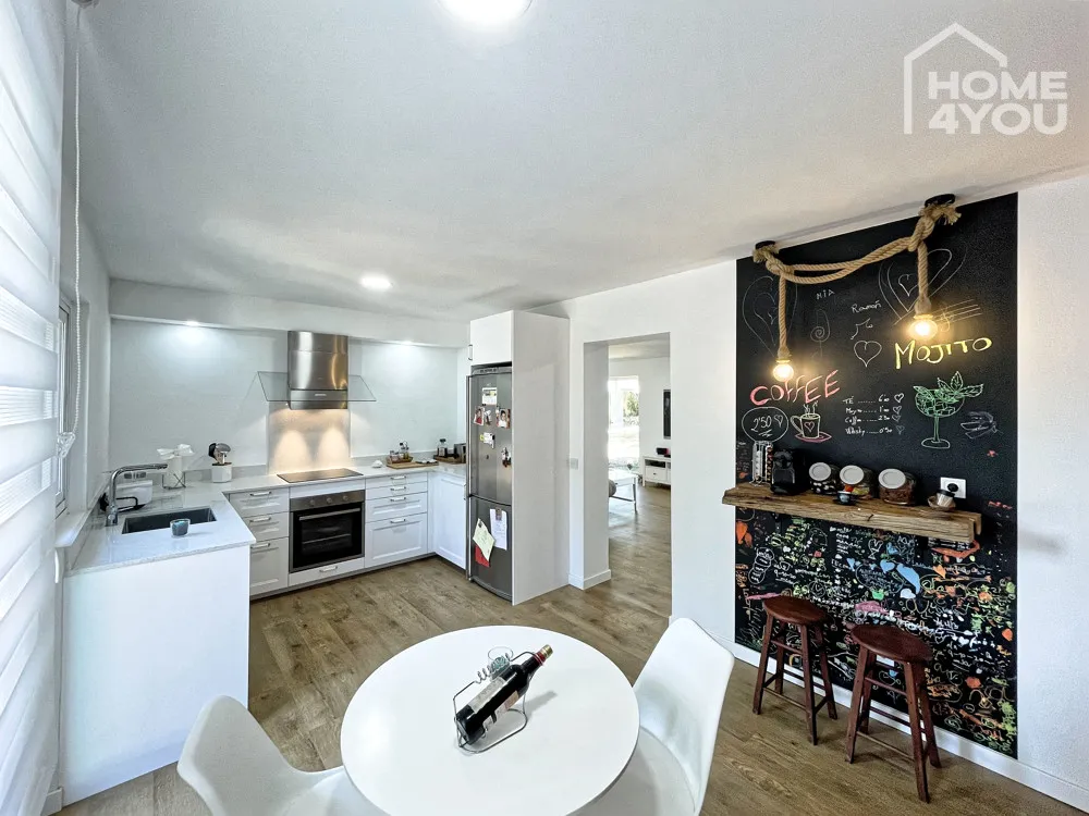 Bereits beim Betreten gelangen Sie in den imposanten Eingangsbereich sowie das offene Wohnzimmer mit direktem Zugang zum Garten. Der Pool lädt im Sommer zu einer kühlen Erfrischung ein und die Hängematte sorgt für die tägliche Entspannung. Ebenso befindet sich hier die vollausgestattete, stilvolle Küche mit Einbauschränken.