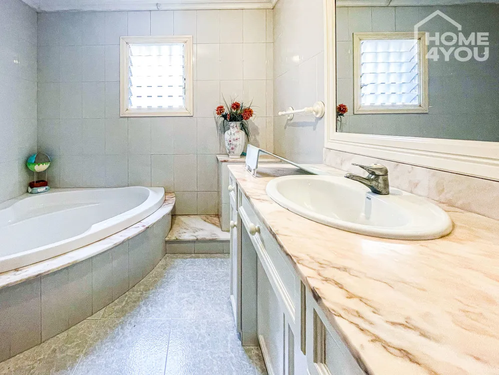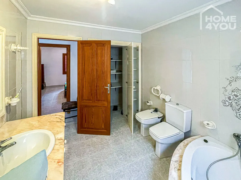 Im Obergeschoss gibt es eine Bibliothek, diese führt zu den 3 Schlafzimmern und zum zweiten Badezimmer. Ebenfalls gibt es im Obergeschoss eine Terrasse, die beide Hausabschnitte miteinander verbindet. Besonders hervorzuheben ist das ansehnliche Badezimmer mit seinen Einbauschränken und hellen, cremefarbenen Armaturen.