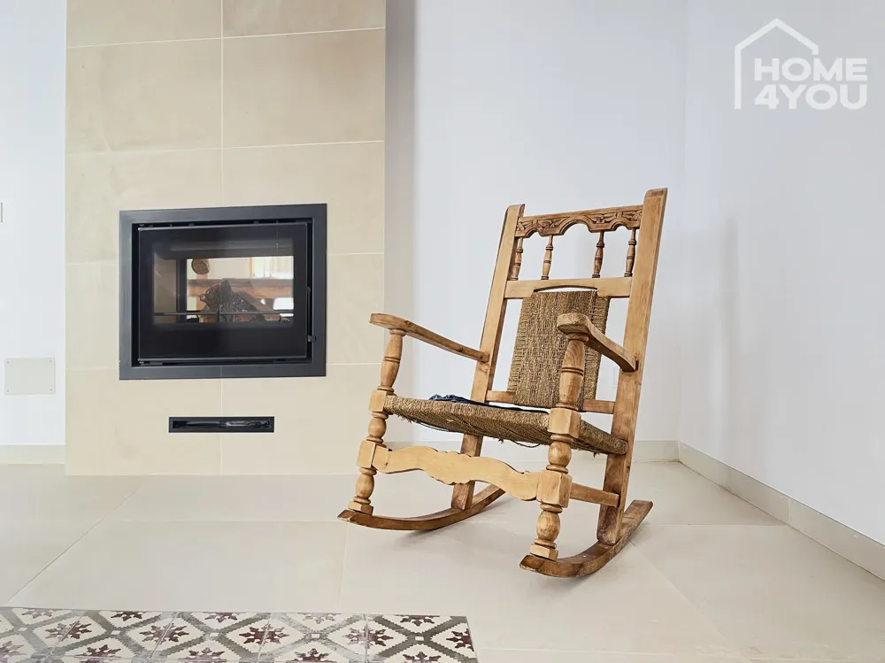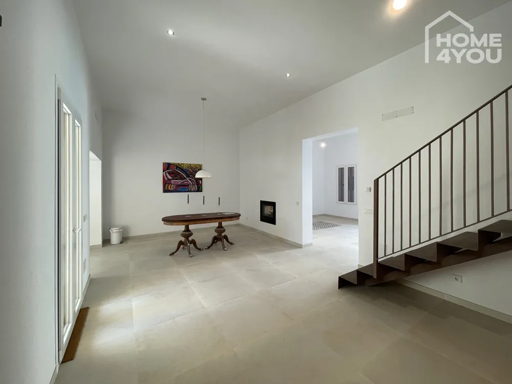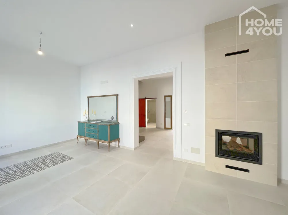 Der durchsichtige Kamin zwischen Esszimmer und Wohnzimmer stellt dabei ebenso ein Design-Highlight dar, wie die mallorquinen Steinarbeiten und die offen gestaltete Treppe zum OG.