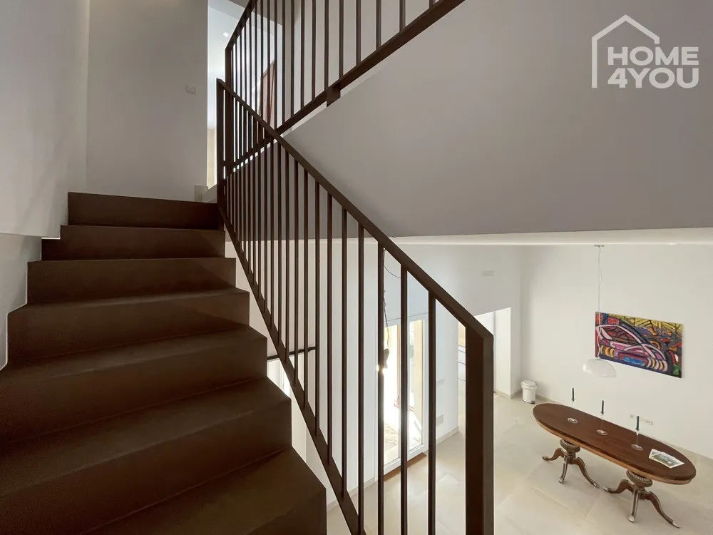 Design-Highlights wie die schwebende Stahltreppe in Rost-Optik, sowie integrierte LED-Strahler in Haus & Garten verbinden die Historie mit der Moderne.