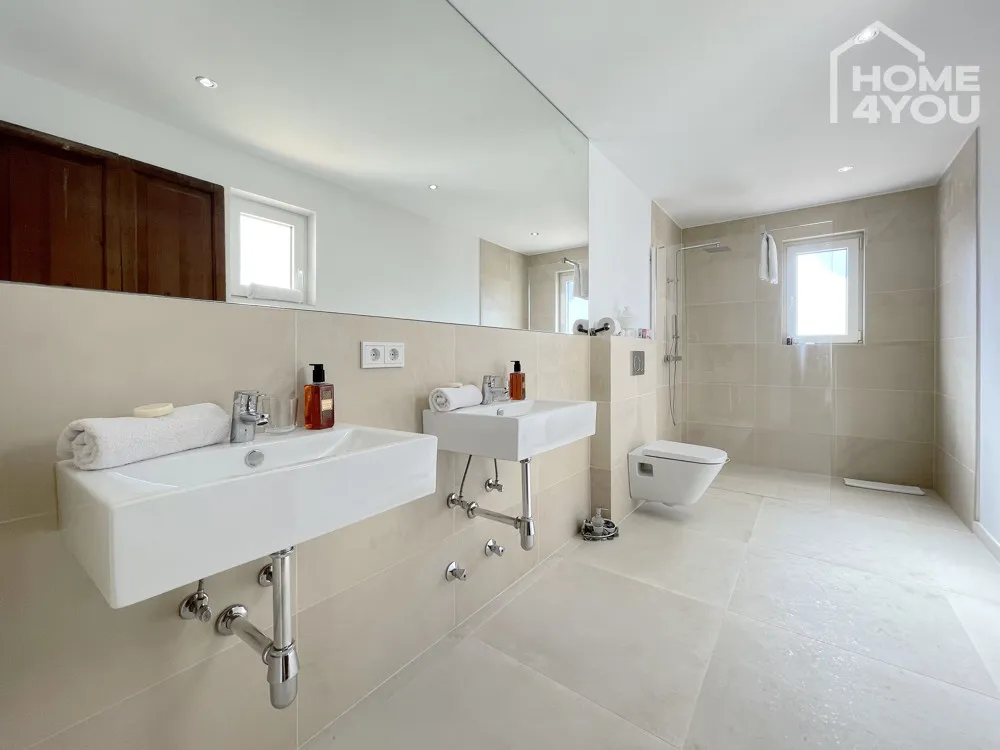 Das OG verfügt über den geräumigen Master-Bedroom mit angrenzendem WC, zwei weitere Schlafzimmer, Flur, ein weiteres großes Duschbad incl. WC, sowie eine Dachterrasse mit Blick auf den Garten.