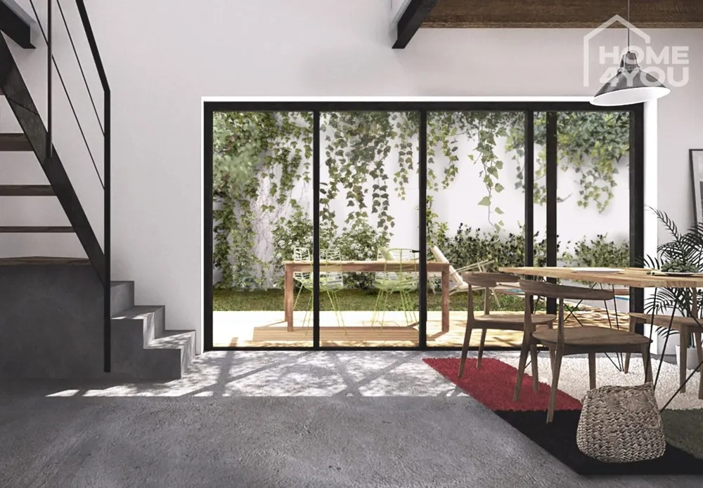 Das Erdgeschoss besteht aus einem geräumigen Wohn-Esszimmer mit einer offenen Küche im modischen Büro-Stil, welche Zugang zur 26qm großen Terrasse mit erfrischendem Whirlpool bietet. Außerdem befindet sich hier ein Schlafzimmer mit gemütlichem Doppelbett und einem hellen Badezimmer. Die enorme Fensterfront, in Richtung der Terrasse, durchflutet die Räumlichkeiten gleichmäßig mit natürlichem Licht und lässt, dank der durchdachten Platzierung, keine ungewollten Blicke eindringen.