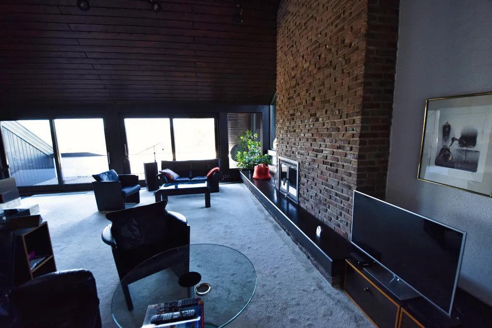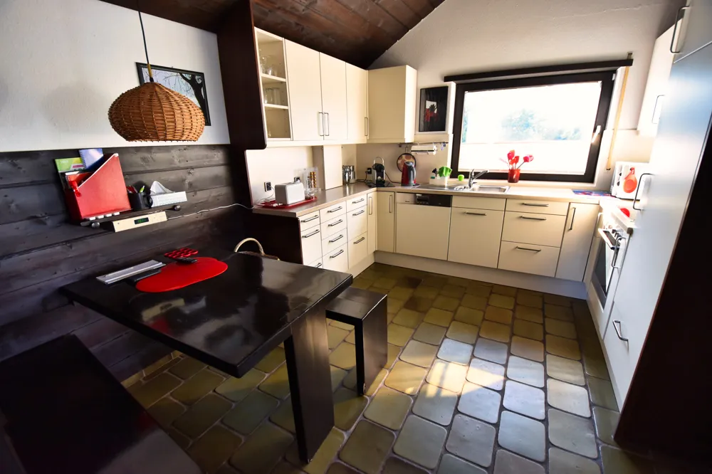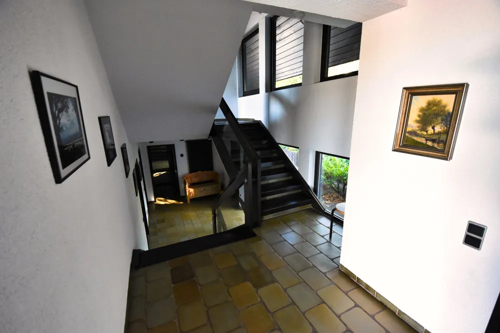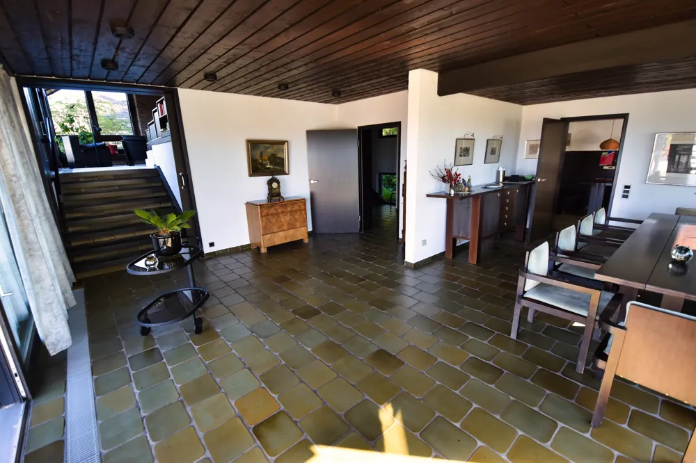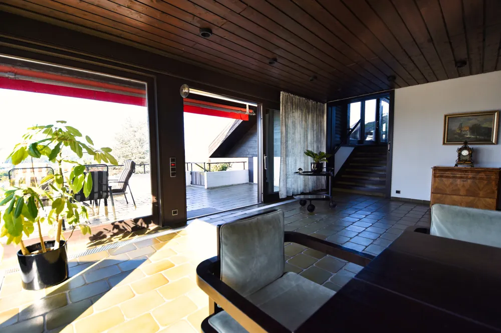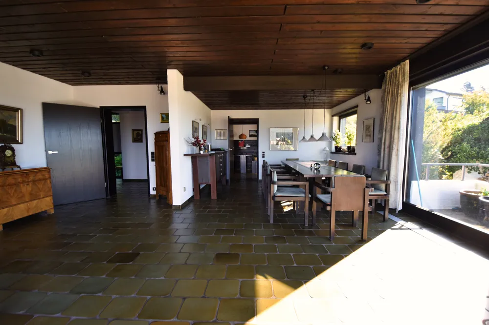 Der über zwei Ebenen verlaufende Wohn- und Essbereich ist ein Ort zum Wohlfühlen und Zusammenkommen. Große Fensterflächen holen das Rheintal ins Wohnzimmer, während der offene Kamin an kühleren Tagen für eine unvergleichlich gemütliche Atmosphäre sorgt. Hier verschmelzen Großzügigkeit und Geborgenheit.