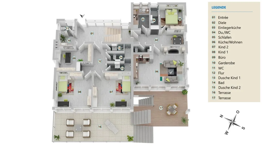 Ein eigener Kinderbereich mit zwei Zimmern und gleich zwei Badezimmern schenkt den Jüngsten ihr ganz persönliches Reich – und den Eltern Gelassenheit. Zusätzlich wartet eine Einliegerwohnung mit separatem Eingang, Terrasse, zwei Zimmern und Bad. Ideal für heranwachsende Kinder, die Großeltern, Gäste oder als private Wellness-Oase – die Möglichkeiten sind grenzenlos.
