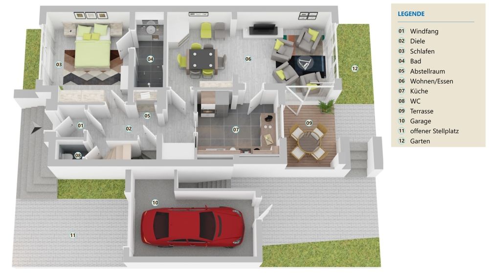 Im Erdgeschoss erwartet Sie ein heller Wohn- und Essbereich mit direktem Zugang zur Terrasse und in den weitläufigen Garten – perfekt für entspannte Familienabende, Kindergeburtstage oder Sommergrillabende. Neben einer separaten Küche finden Sie hier außerdem ein Schlafzimmer mit eigenem Bad sowie ein Gäste-WC.