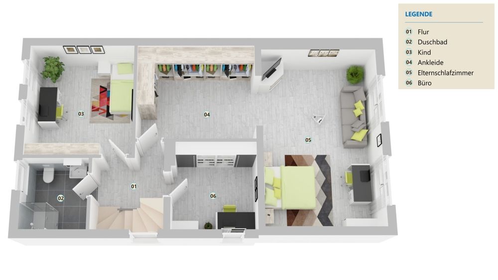 Im Obergeschoss gibt es Platz für die ganze Familie: ein Elternschlafzimmer mit Ankleide, zwei gemütliche Kinderzimmer und ein modernes Bad.