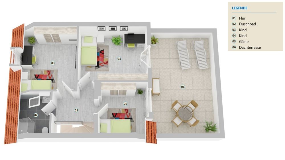 Die Mansarde bietet mit zwei weiteren Zimmern zusätzliche Rückzugsorte – ideal als Homeoffice, Jugendzimmer oder Kreativbereich. Ein Highlight: die große Dachterrasse mit tollem Ausblick.