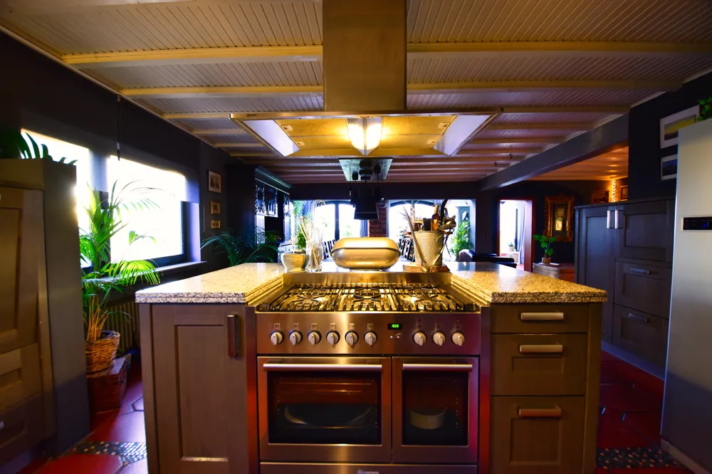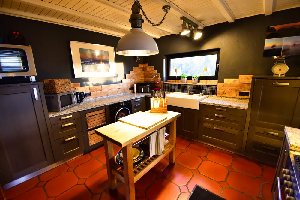 Der Eingangsbereich im Erdgeschoss ist großzügig gestaltet und verfügt über ein Gäste-WC. Von hier aus erschließen sich der offen gehaltene Wohn-, Ess- und Küchenbereich mit angeschlossenem Wintergarten sowie ein separates Wohnzimmer mit offenem Kamin. Ergänzend befinden sich auf dieser Ebene ein Bürozimmer sowie der Elternschlafbereich mit angeschlossenem Badezimmer. Die Gestaltung des Erdgeschosses ist durch Terracotta-Fliesen und großflächige, bodentiefe Fenster geprägt, die für eine gute Belichtung sorgen.