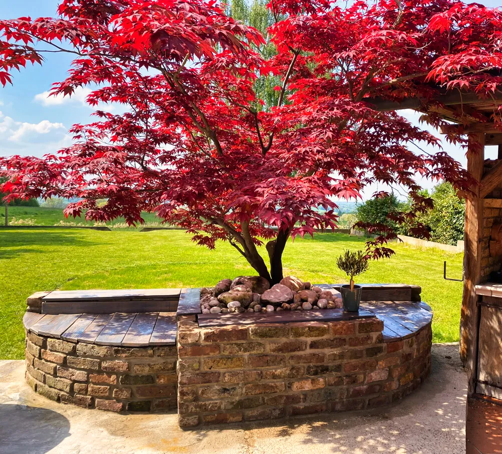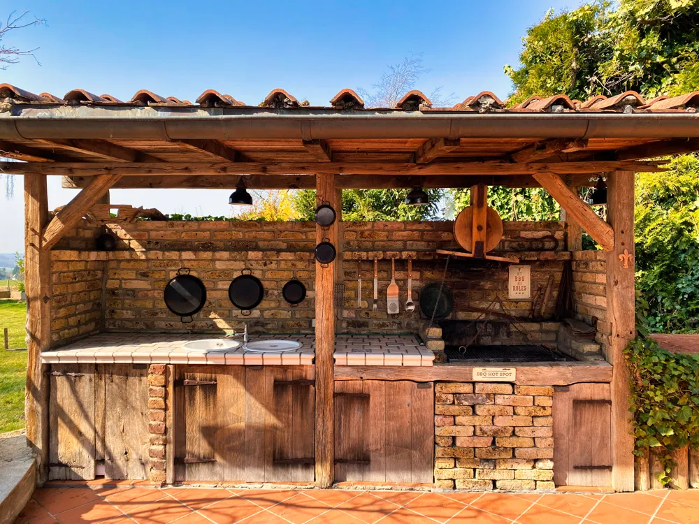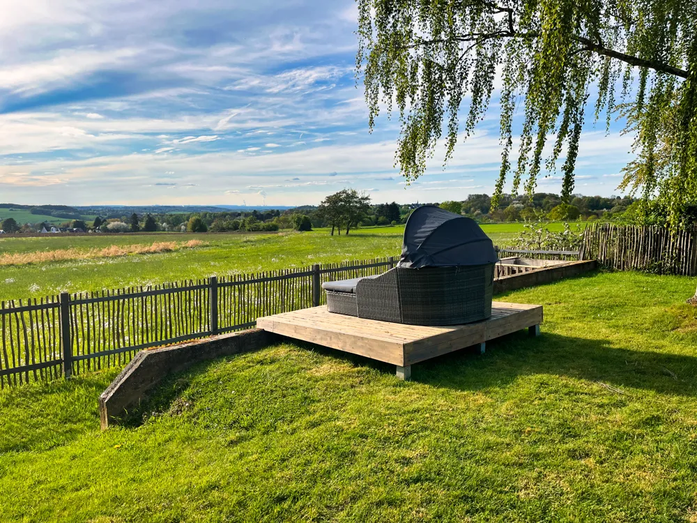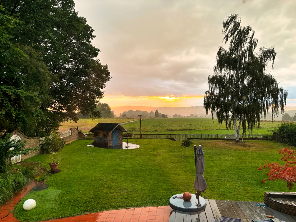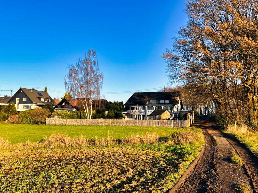 Das Grundstück ist gepflegt angelegt und bietet verschiedene Terrassenflächen, Grün- und Liegebereiche sowie eine Outdoorküche mit Grill. Es besteht ein unverbaubarer Blick über angrenzende Felder in Richtung Siebengebirge und die Kölner Bucht. Die Lage grenzt unmittelbar an einen Feld- und Wirtschaftsweg an.