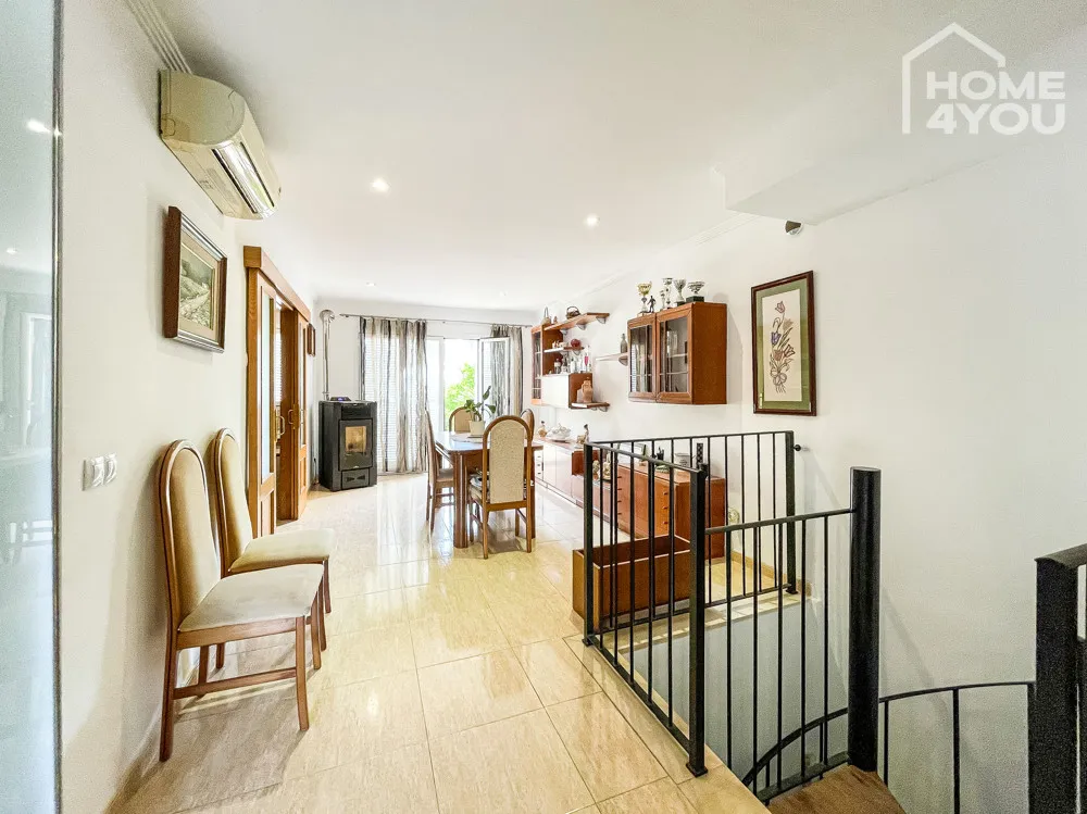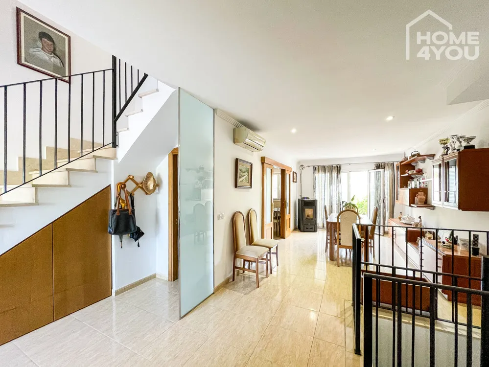 Durch den Eingang gelangen Sie, wie auf Mallorca oft üblich, direkt in den hellen Wohn-Essbereich mit angrenzendem Gäste-WC und eine Treppe ins Obergeschoß. Weiter hinten gelangen Sie in den offenen Essbereich - mit einem Pellet-Kaminofen ausgestattet ist - der in den kühleren Monaten, kuschelige Wärme verspricht. Zudem gibt es hier einen Ausgang zu einer wundervollen Terrasse, mit seinem schön eingewachsenen Gartenteil.