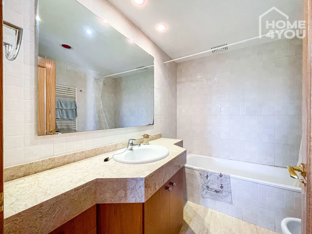 Das Masterschlafzimmer besticht hier, durch seinen eingebauten, offenen Kleiderschrank und die beiden großen, bodentiefen Kunststofffenster, sowie das großzügige Bad en Suite, mit Einbauschrank, landestypischen Fliesen und großem Spiegel.