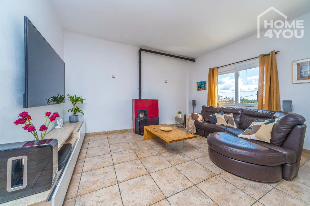 Hier befindet sich das großräumige Wohnzimmer mit Pellet Kaminofen, der für die kälteren Wintertage wohlige Wärme verspricht. Ebenso wie einen hellen Essbereich, der mit Ausgang zu einem kleinen Balkon, einen direkten Treppen-Zugang zur unteren Terrasse mit Pool bietet.
