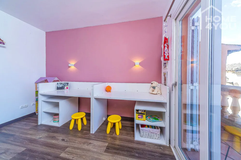 Die Zimmer haben jeweils einen Zugang zum Balkon, der eine schöne Aussicht und bei lauen Sommernächten Abkühlung verspricht. Die gesamte Ebene ist mit einem hochwertigen Laminatboden ausgestattet, der eine angenehme Barfuß-Atmosphäre und entsprechende Kühle im Sommer schafft.