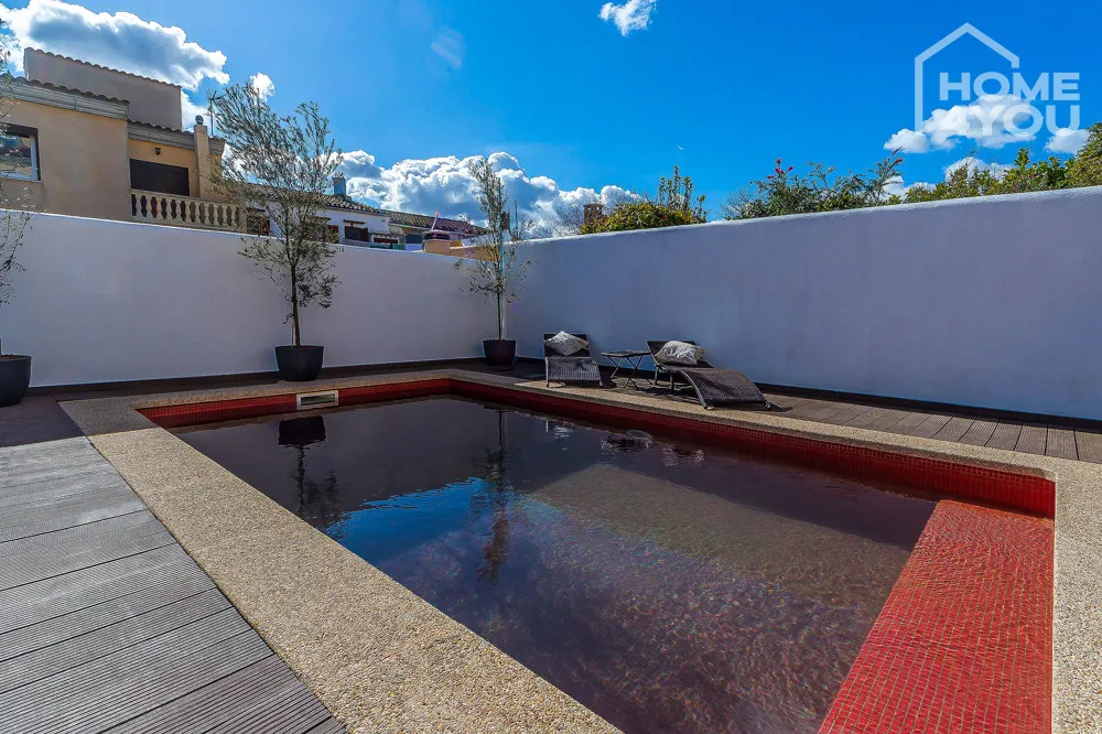 Der Außenbereich lädt sie ein, auf der einen Seite mit seiner nach Süden ausgerichteten, mit Bangkirai-Holz veredelten Terrasse, die viel Sonne verspricht, mit Chillout Area, Außenküche und Gasgrill, hier können sie mit Freunden und Familie herrliche Grillevents erleben. Auf der anderen Seite finden sie hier abgetrennt durch eine chice Glasbrüstung den eingelassenen Pool mit Liegen zum Relaxen.