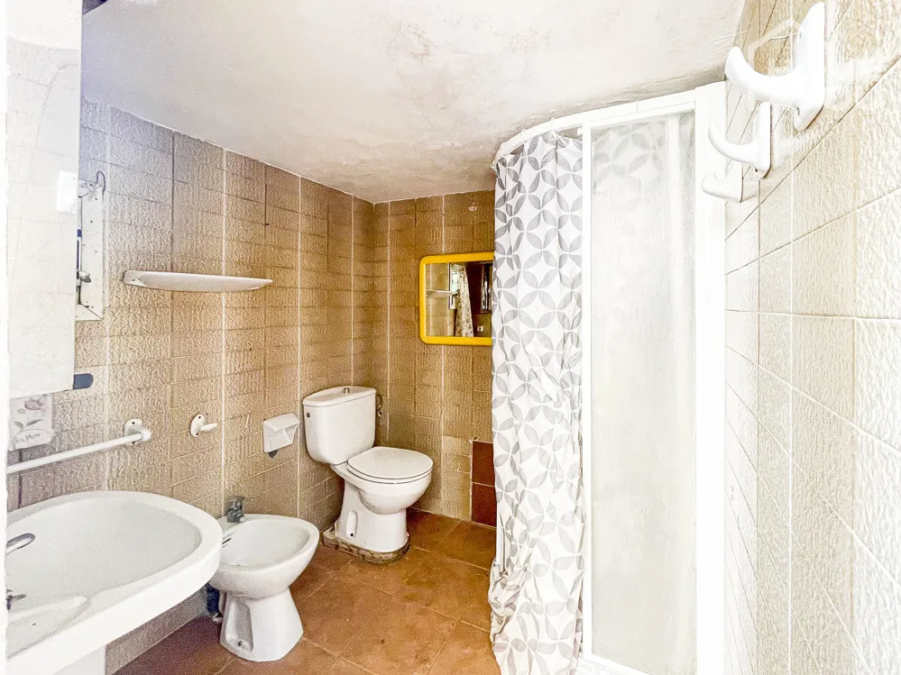 Ins Obergeschoss findet man über einen separaten Eingang mit Treppe, die in einen Wohnbereich mit Kamin, 5 weiteren Schlafzimmern und einer Küche führt. Von dieser gelangt man ebenfalls in ein Badezimmer und einen HWR-Raum. Ebenso wie auf die herrliche Dachterrasse mit Blick auf den Innenhof und über die Dächer Manacors.