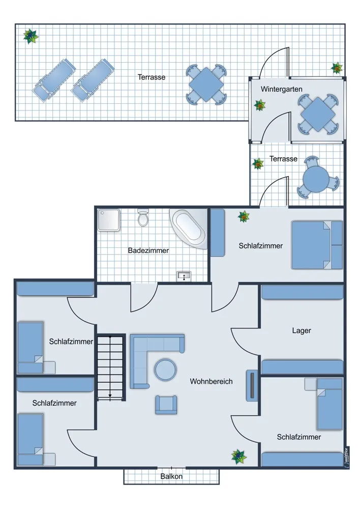 Das Obergeschoss zeichnet sich durch seine 4 gemütlichen Schlafzimmer aus. Eines davon hat einen direkten Zugang zur eigenen Sonnenterrasse mit Wintergarten. Auf dieser Ebene befindet sich 1 weiterer Räume sowie ein Badezimmer.