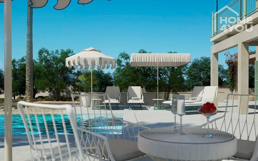 Der Außenbereich ist über den Wohnbereich oder die 2 Schlafzimmer im EG verbunden. Er beginnt mit einen Chillout- und Essbereich und führt über den Liegebereich zum Infinitypool mit Jacuzzi. Des Weiteren bietet er einen großartigen Garten mit Palmen, die den Pool umgeben und mediterranes Flair erschaffen.