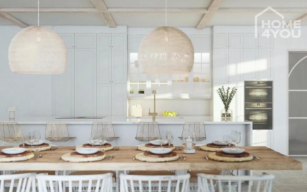 Links vom Wohnbereich liegt der Essbereich mit rustikalem Tisch für bis zu 12 Personen und die offene vollausgestattete Küche mit moderner Insel mit Kochfeldern und Spüle. Mit Blick auf den Garten mit seinem Infinitypool kommt sowohl jeder Koch als auch Gast auf seine Kosten. Ebenso befindet sich hier ein weiteres Schlafzimmer en suite und ein Gäste-WC.