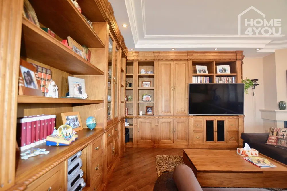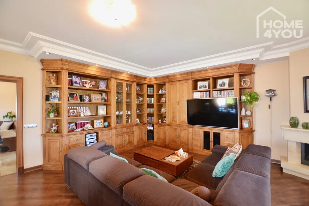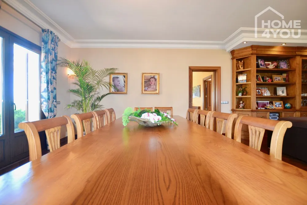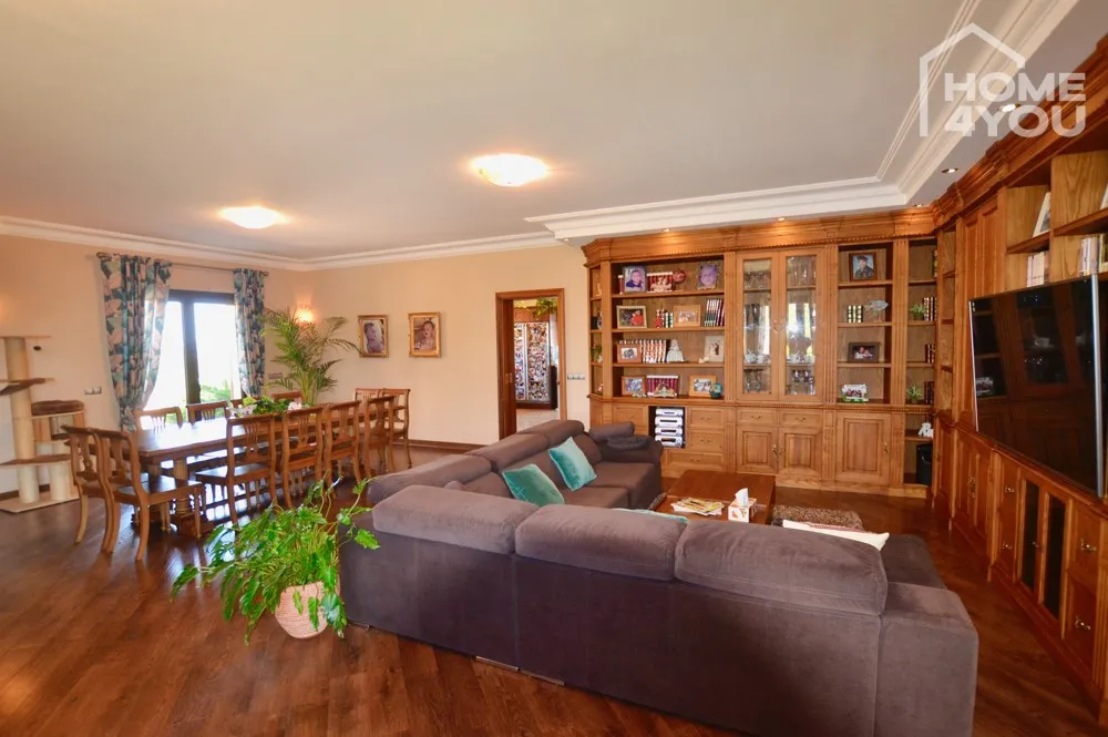 Rechts gelegen befindet sich der großzügige Wohn-/ Essbereich. Ein Kamin, die massiven Echtholzmöbel und ein Zugang zum Außenbereich sorgen für einen hochwertigen Eindruck.