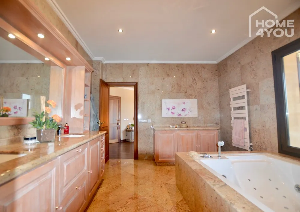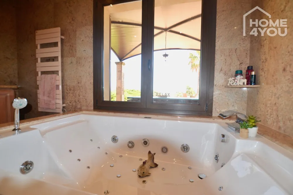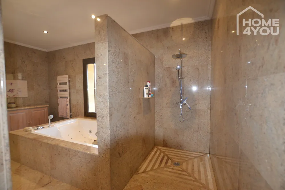 Auf der linken Seite befindet sich der Schlaftrakt mit 1 Master-Bedroom und Badezimmer "en suite". Dieses Luxus-Badezimmer mit eigenem Jacuzzi und Fernsicht auf die Berge, begehbarer Dusche und edlem Granit sorgt direkt am Morgen für gute Laune.