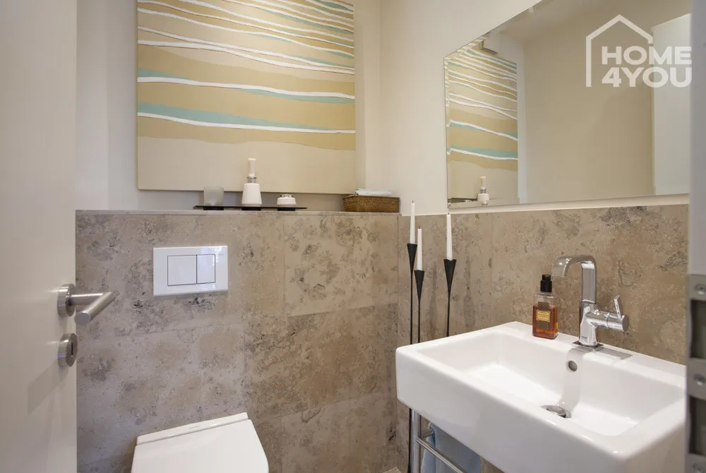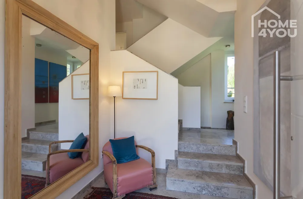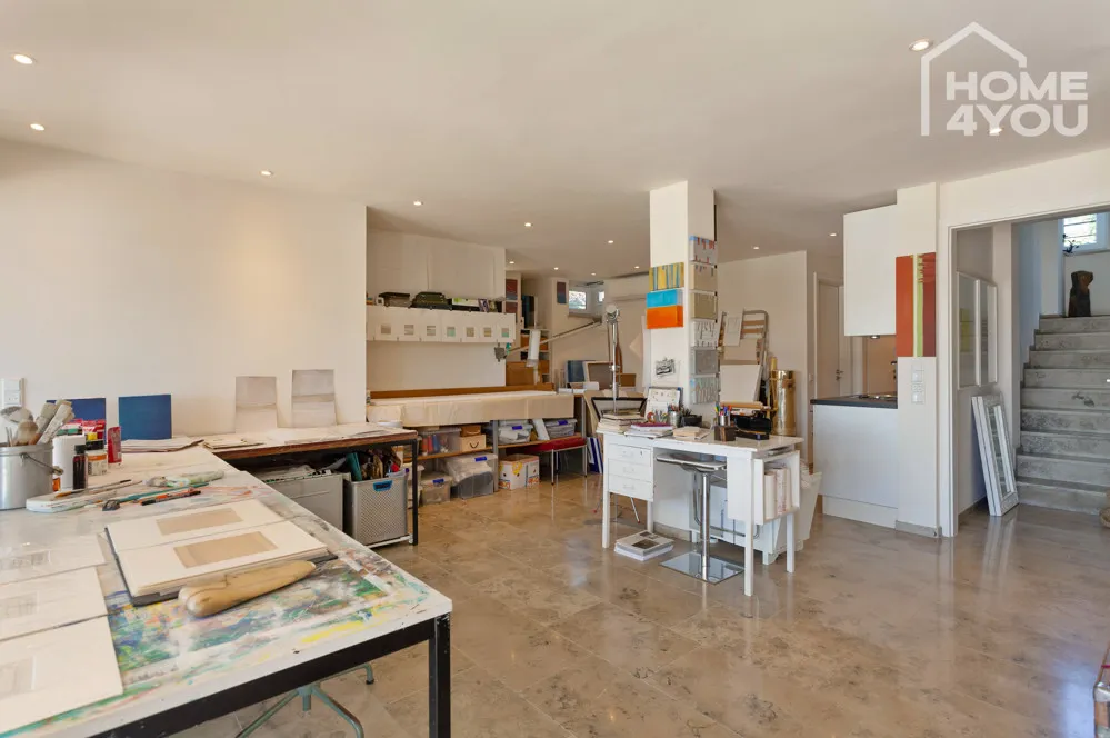 Der licht- und stilvolle Eingangsbereich führt über die Marmortreppe sowohl in das weitläufige Atelier als auch in den 1.Stock zum Wohn- und Essbereich. An diesem schließt sich die Küche an, die mit hochwertigen Küchengeräten ausgestattet ist. Außerdem befindet sich auf dieser Ebene ein Schlafzimmer mit Bad en Suite sowie ein weiteres Gäste-WC.