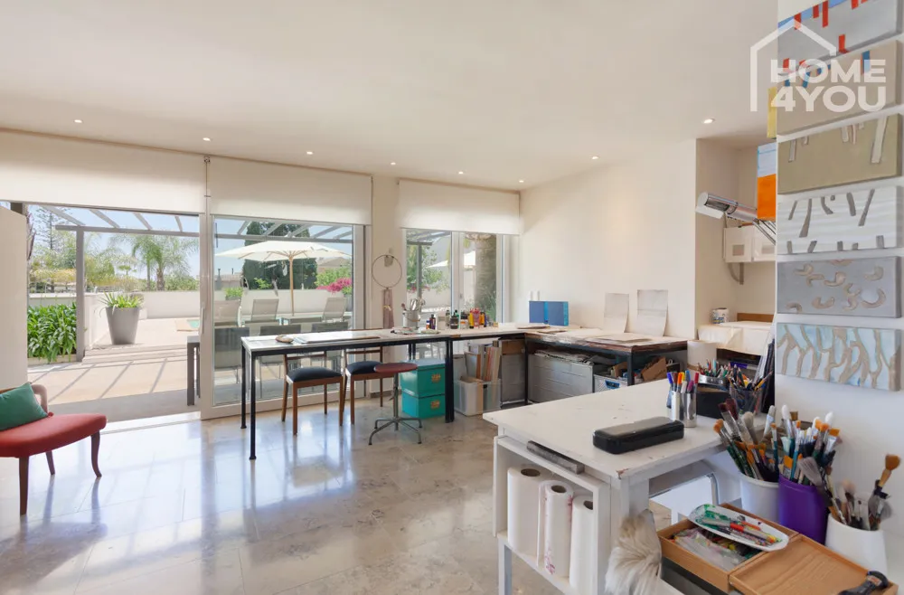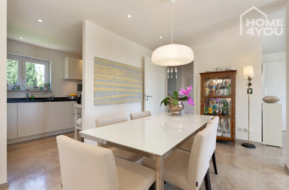 Im Erdgeschoss befindet sich ein großes Atelier mit direktem Zugang zum Salzwasserpool, den großzügigen Außenterrassen und der wunderschönen Gartenanlage. Mit Verbindung zur modern gestalteten Terrasse, könnte hier ein Sommerwohnzimmer und damit ein Ort für besondere Zusammenkünfte entstehen. Ein Gäste-WC, ein Hauswirtschaftsraum und eine Garage mit elektrischem Tor sind ebenfalls auf dieser Etage vorhanden.