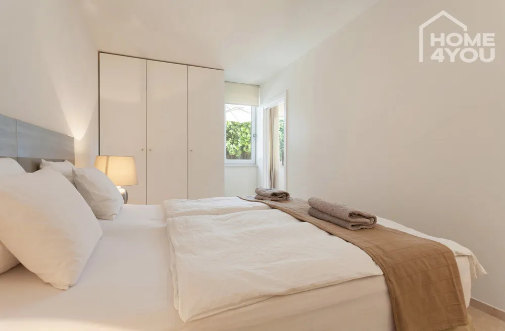 Auf der zweiten Etage gibt es drei Schlafzimmer und zwei Badezimmer (eins davon en Suite). Von allen Schlafzimmern aus hat man Zugang zu einem Balkon mit Blick auf die paradiesische Gartenanlage und den Pool. Maßangefertigte Einbauschränke gliedern sich mit weißen Schiebetüren unauffällig in das Interieurdesign ein und bieten, wie auch der vorhandene Dachboden, großzügigen Stauraum für die gesamte Familie.
