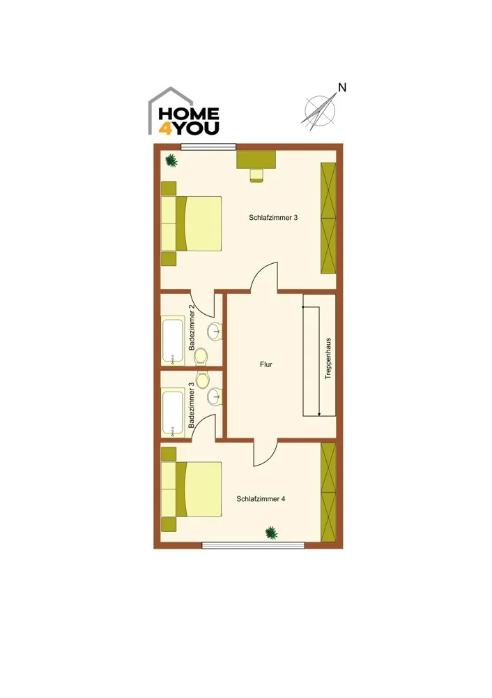 Im 2. OG finden Sie analog 2 freundliche Schlafzimmer mit jeweils einem Bad en Suite. Von hier aus führt das Treppenhaus weiter auf die sonnige Dachterrasse.
