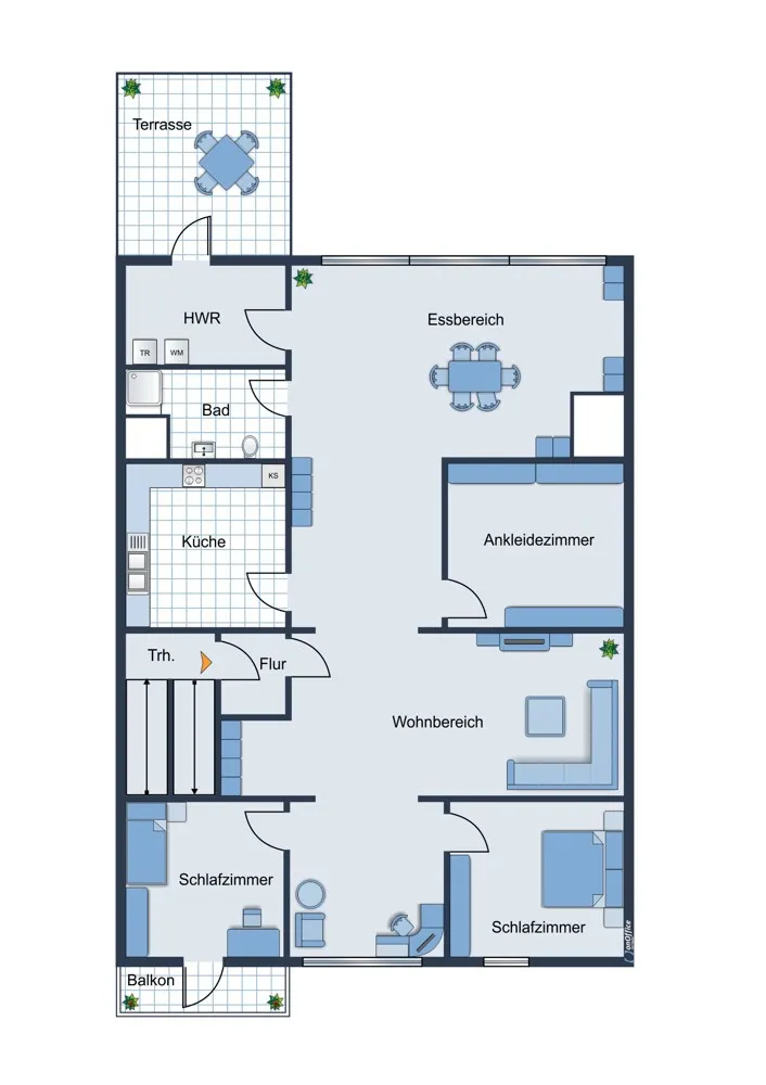 Links vom Wohnbereich befindet sich die moderne Küche, ein Ankleidezimmer, ein stilvolles Bad sowie der helle Essbereich mit einem weiteren Pellet-Kamin. Von hier aus gelangen Sie über den HWR auf die geräumige Terrasse mit Südausrichtung.