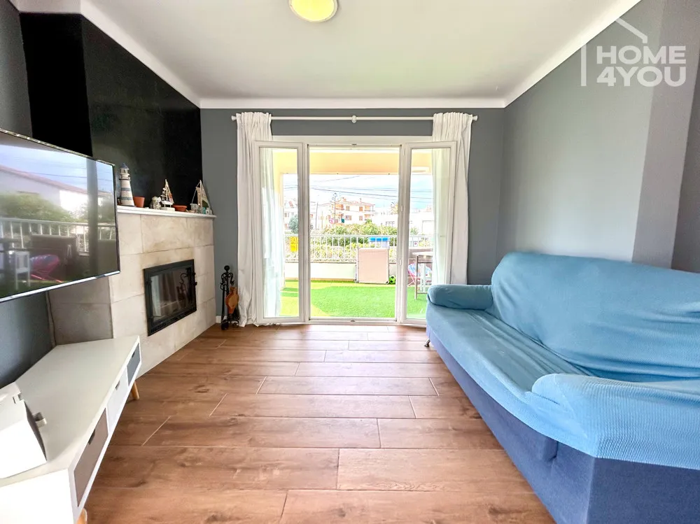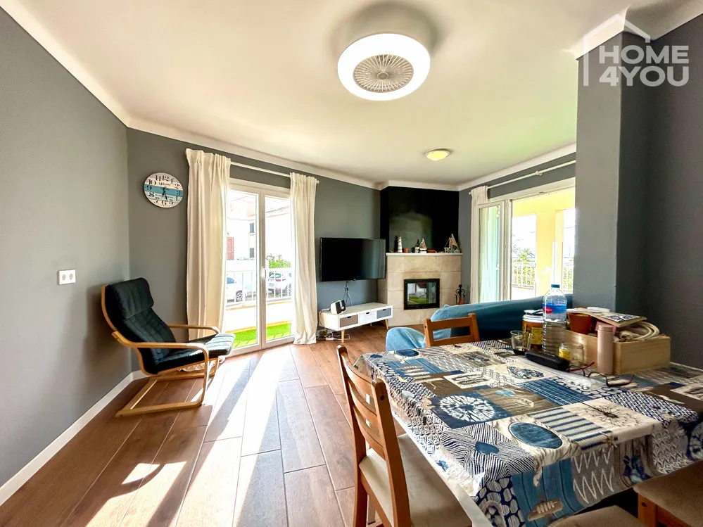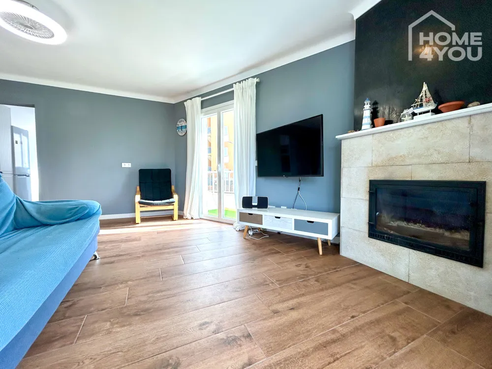 Das geräumige lichtdurchflutete Wohnzimmer mit Kamin wirkt gemütlich und lädt zum Verweilen ein. Hier wurde der Boden vor Kurzem erneuert mit einer modernen Holzoptikfliese versehen. In der separaten Küche befindet sich eine helle moderne Einbauküche.