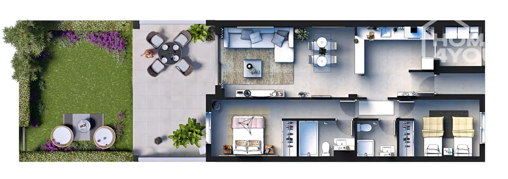 2 Schlafzimmer, 2 Bäder, ein geräumiger Wohn-/Essbereich mit Zugang zur privaten Terrasse und Garten auf rund 127qm bieten viel Raum für Ihren zukünftigen Lebenspunkt auf Mallorca. Der Master-Bedroom hat ein Badezimmer „en suite“.