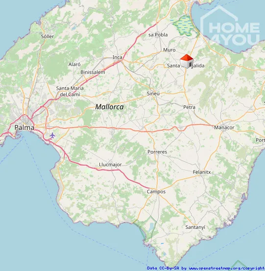 Die Gemeinde Santa Margalida liegt rund 45 Kilometer von der Inselhauptstadt Palma entfernt. Sie ist Teil der Region (Comarca) Plà de Mallorca oder Es Plà, der großen Ebene der Inselmitte.