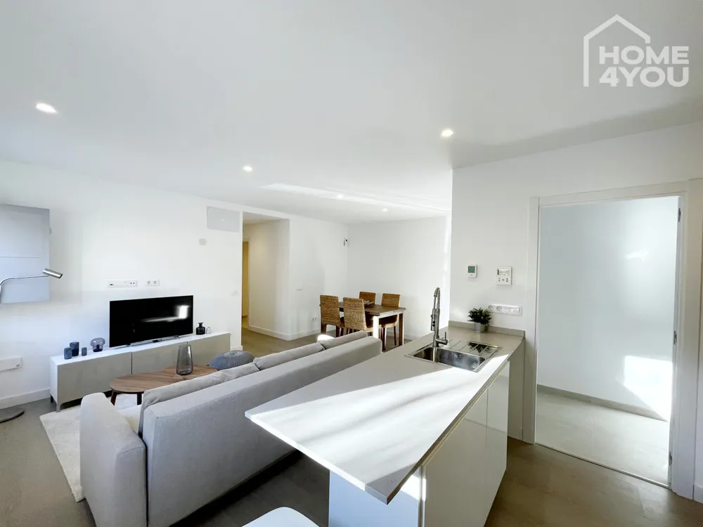 In dem großen Wohnzimmer ist ausreichend Platz für eine gemütliche Sitzecke, die bereits vollständig ausgestattete & moderne Küche und den Essbereich.