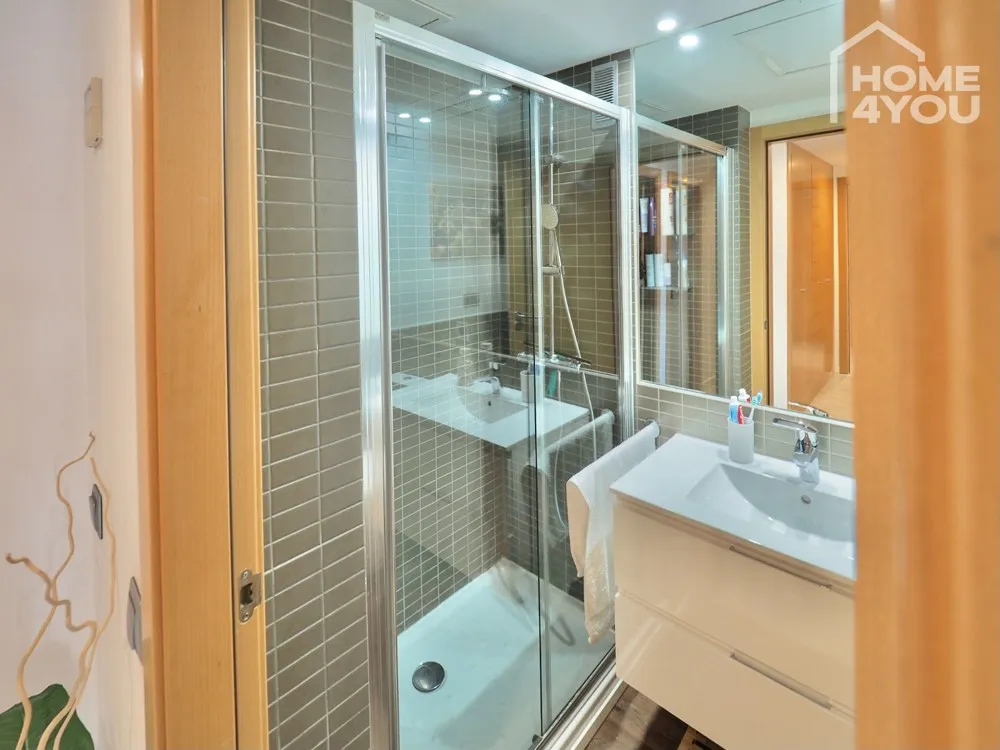 Auf der Etage befindet sich zudem noch ein weiteres Badezimmer mit wertigen Marmor-Fliesen und einer Dusche.