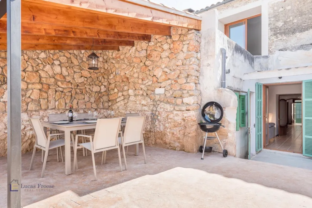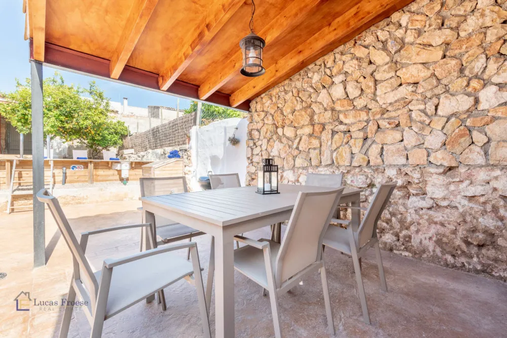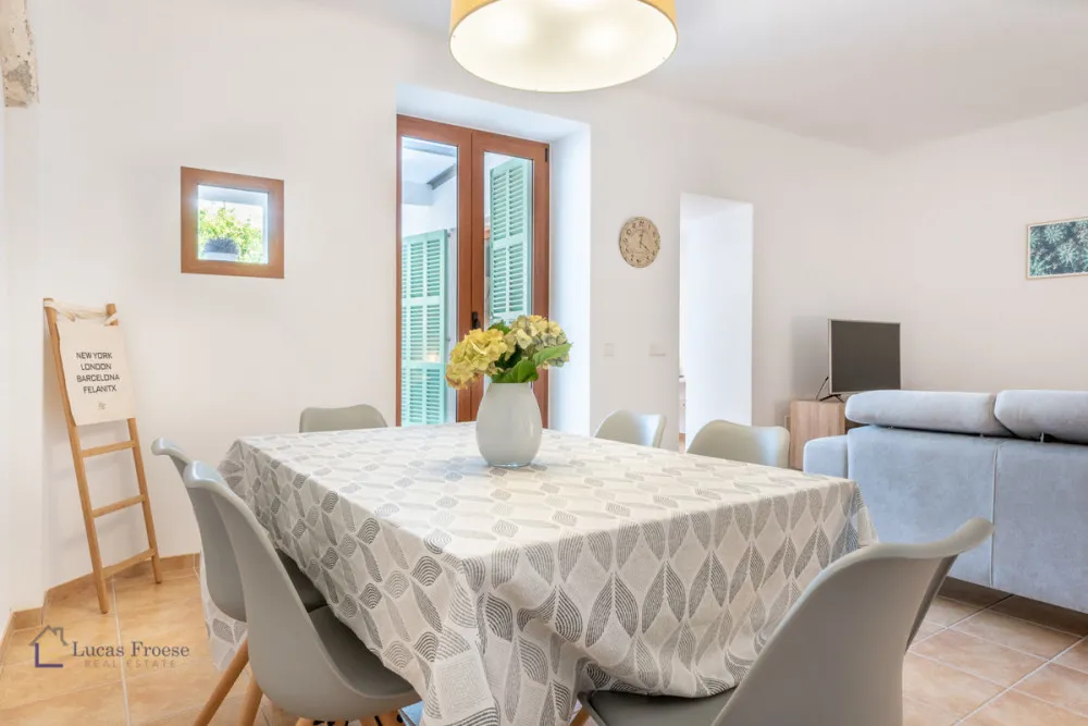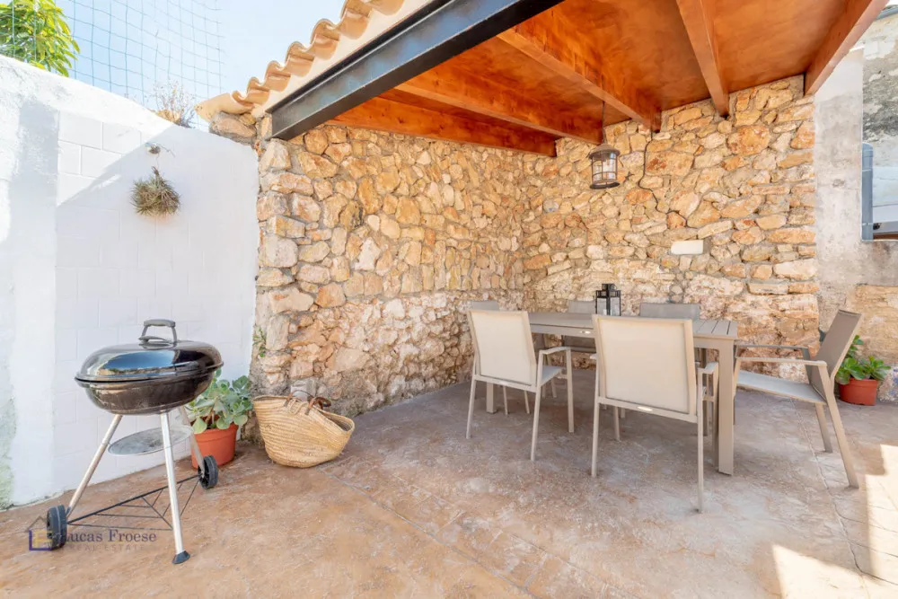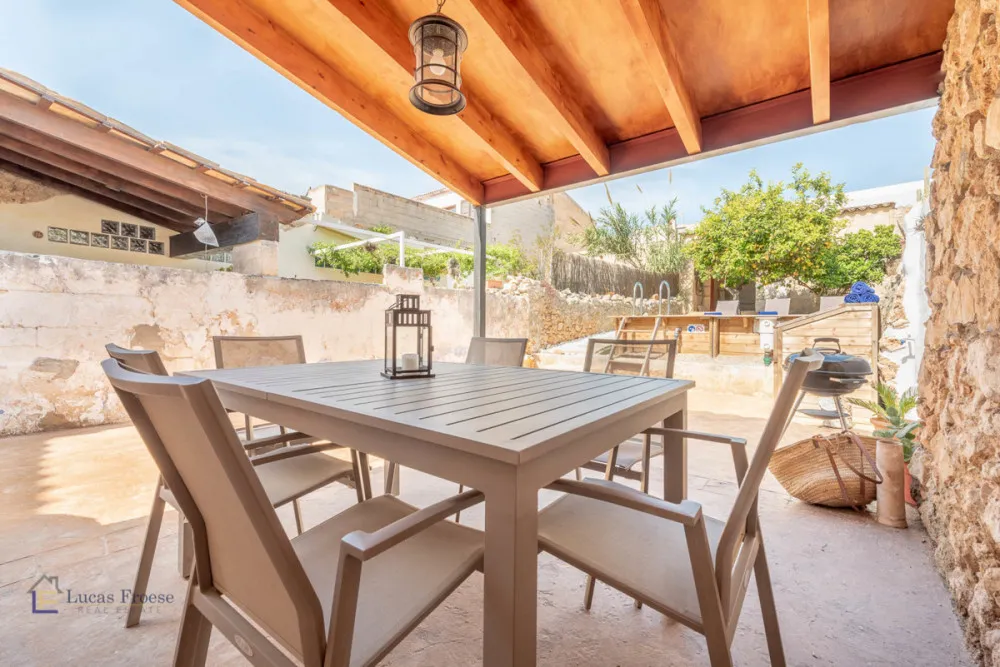 Dieses charmante Stadthaus in Felanitx vereint moderne und rustikale Elemente und verfügt über einen Innenhof mit einem Pool und einem überdachten Sitzbereich.