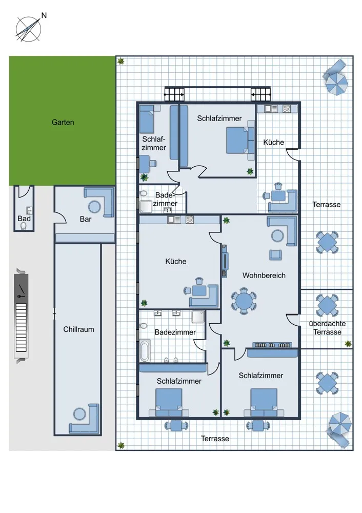 Der Außenbereich hinter der Finca ist sehr großzügig angelegt, es gibt dort etliche Chillout Möglichkeiten, Terrassen mit reichlich Platz.
