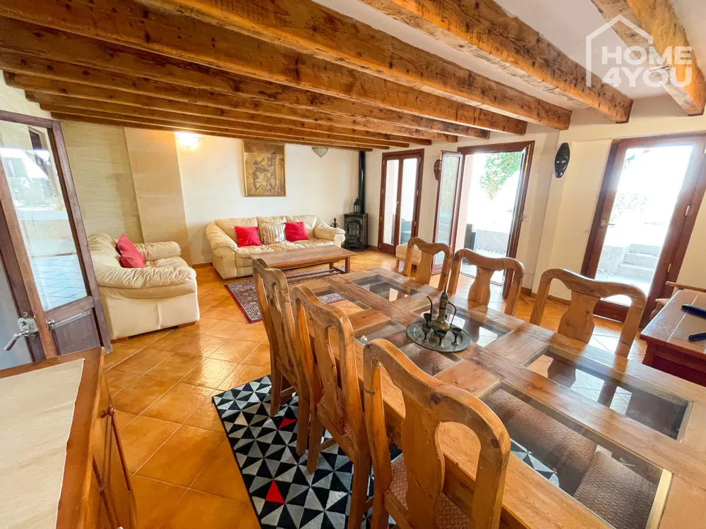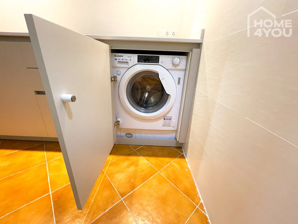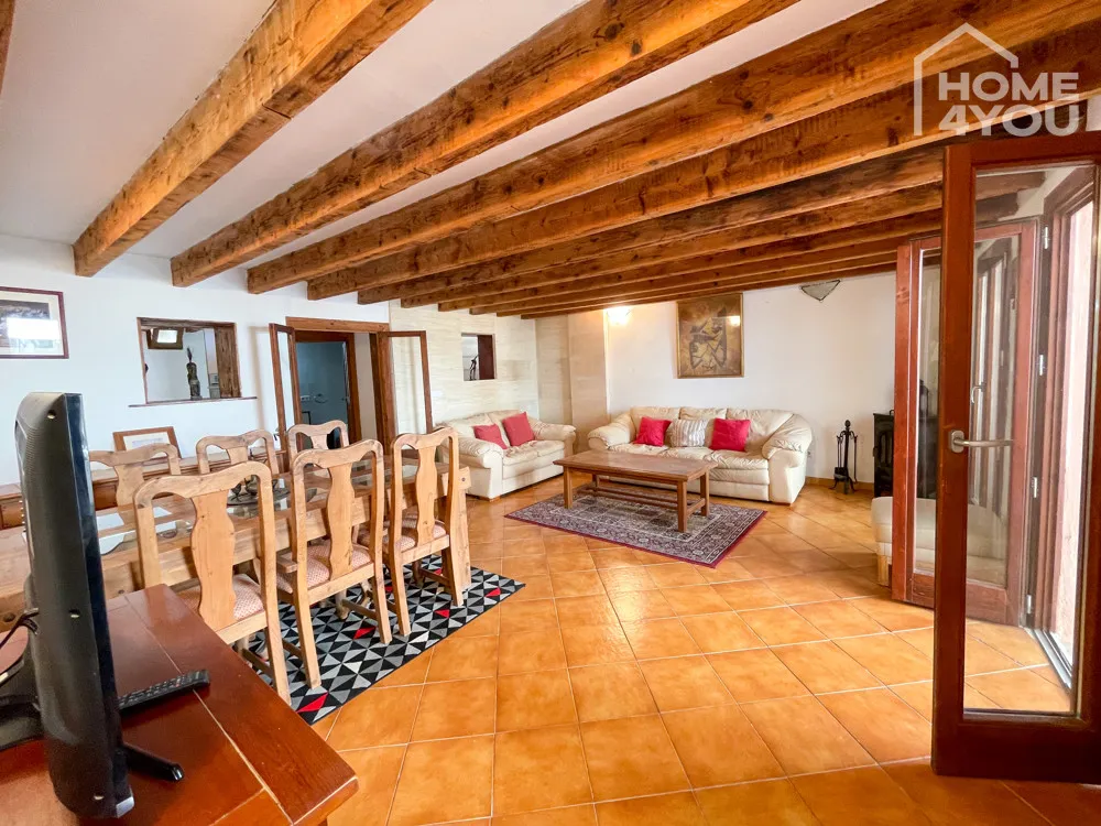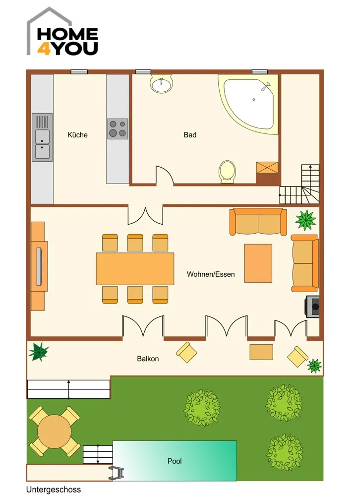 Folgt man der Treppe ins Untergeschoss, so gelangt man zu einem großzügigen Wohn- und Essbereich mit Kamin und direktem Zugang zum mediterranen Garten mit Pool. Eine räumlich getrennte und neu renovierte Küche, ausgestattet mit unbenutzten Elektrogeräten mit Garantie, rundet diesen Bereich ab. Daneben befindet sich noch ein Bad mit Badewanne.