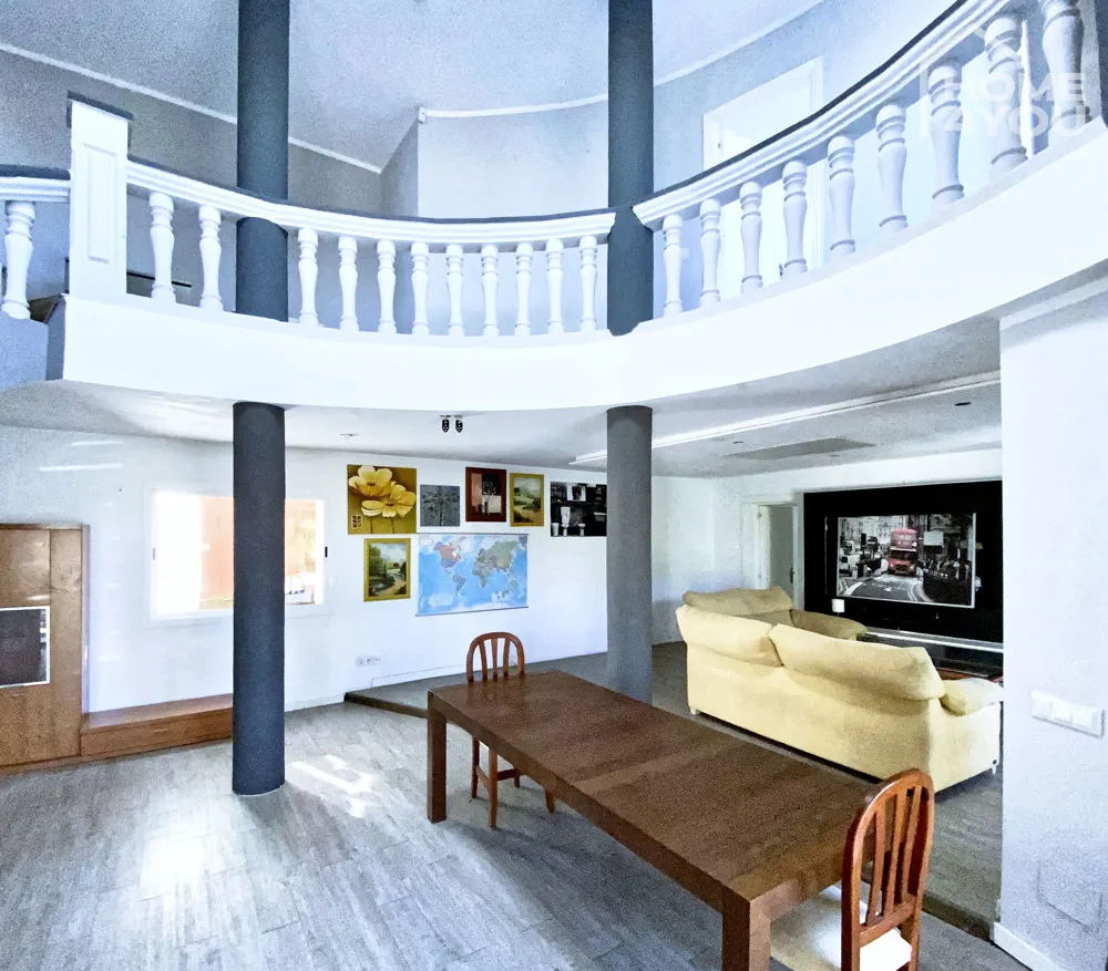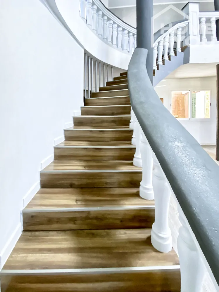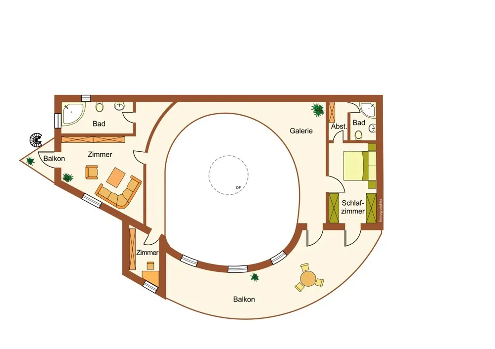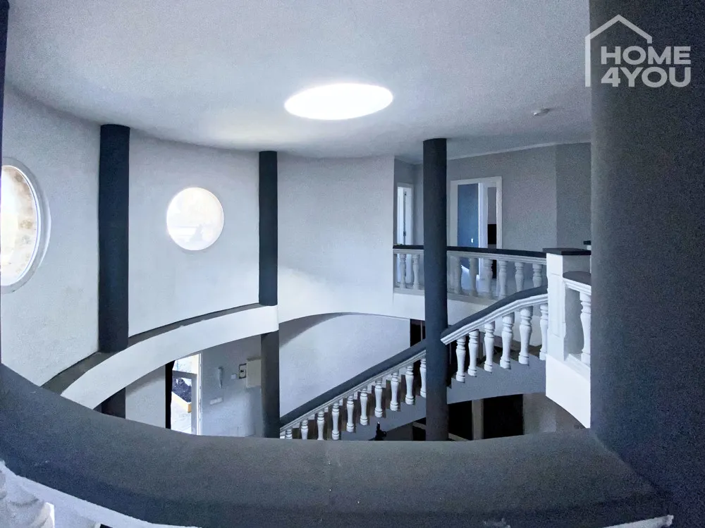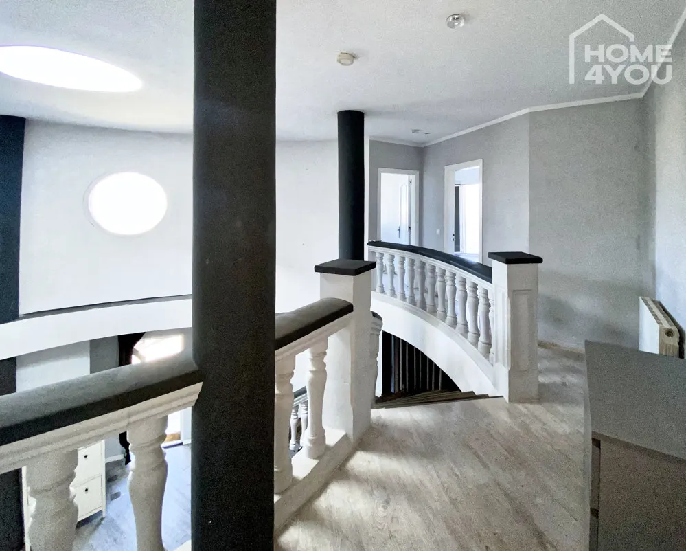 Das obere Stockwerk besticht durch die auffallend schöne Galerie und die ausgefallenen runden Fenster. Diese sorgen für einen besonders hellen Lichteinfall.