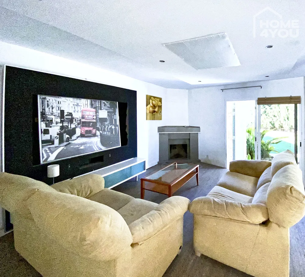Im Erdgeschoss befindet sich ein imposanter Eingangsbereich sowie das offene Wohnzimmer mit direktem Zugang zum Garten. Der Pool lädt im Sommer zu einer kühlen Erfrischung ein und die Sauna sorgt im Winter für wohlige Wärme. Ebenso der Kamin im Wohnzimmer unterstützt die Gemütlichkeit und Wärme in den kälteren Monaten.