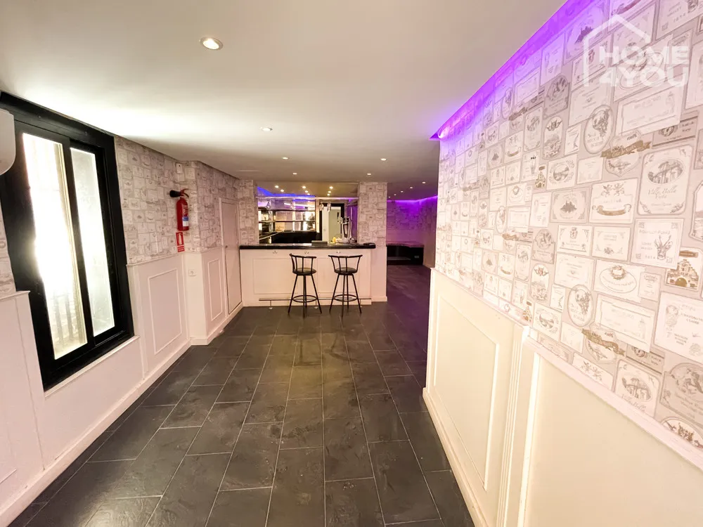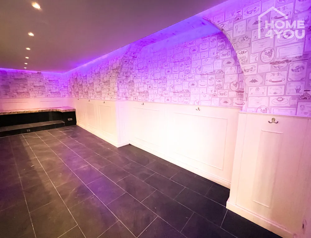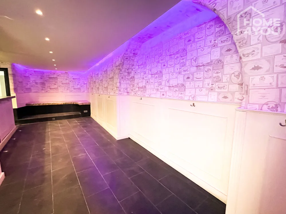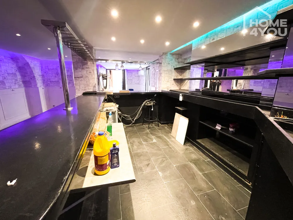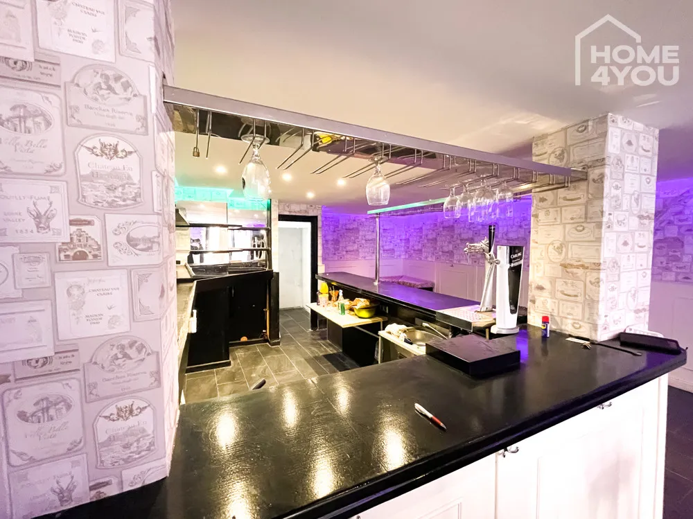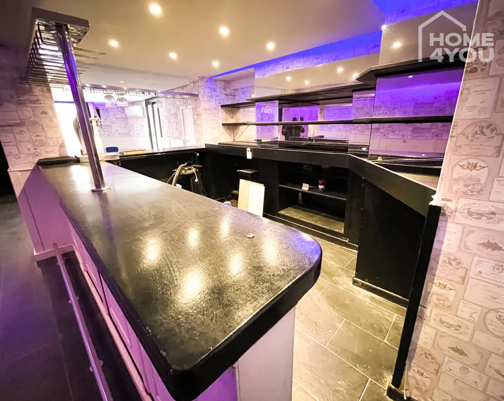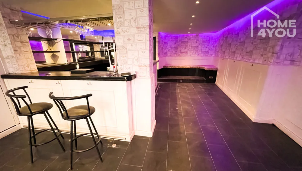 Eine lange Theke mit verspiegelter Rückwand schmückt den offenen Hauptraum der Bar. Die mit Liebe zum Detail halb vertäfelten und halb tapezierten Wände verleihen diesem Gewerbeobjekt seinen ganz einzigartigen Stil.