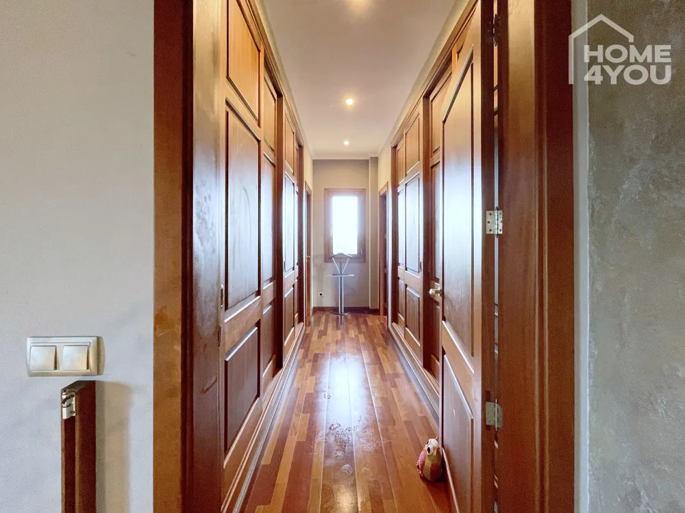 Über die detailgetreue Steintreppe im imposanten Eingangsbereich gelangen sie in das Obergeschoss, hier gibt es ein großes Master-Schlafzimmer mit Bad en Suite. Dieses erreichen Sie durch ein Ankleidezimmer mit Einbauschränken. Dieser Bereich ist mit Laminat ausgelegt. Das stilvolle Badezimmer mit eigenem Balkon lässt keine Wünsche offen.