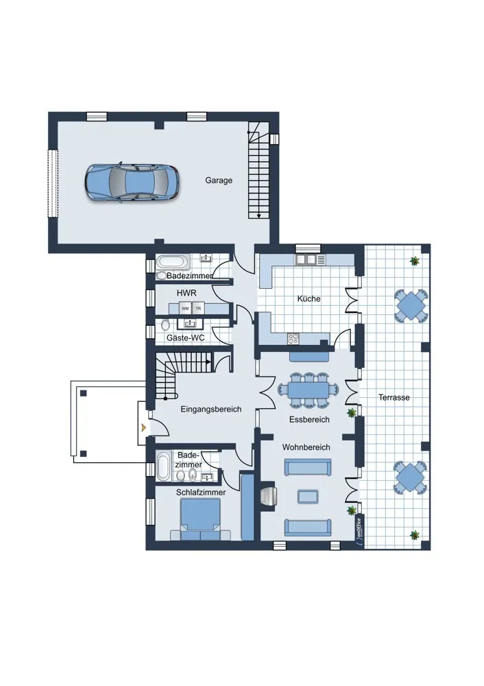 Zu Ihrer Rechten gelangen Sie in ein schönes Schlafzimmer mit Badezimmer en Suite. Links vom Eingangsbereich folgt die üppige Küche mit viel Arbeitsfläche und ausreichend Steckdosen. Auch hier ist ein Ausgang zur Veranda anzutreffen. Anliegend befinden sich der HWR, die Garage mit 2 Stellplätzen und ein Gäste-WC.