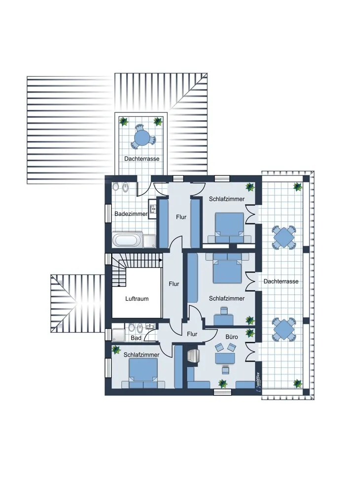 Abgerundet wird das Obergeschoss durch die Dachterrasse mit fantastischem Blick. Hier genießen Sie Sonne pur den ganzen Tag bis zum Sonnenuntergang, wo es sich bei einem Gläschen Vino den Tag ausklingen lässt …“Viva la Vida“.