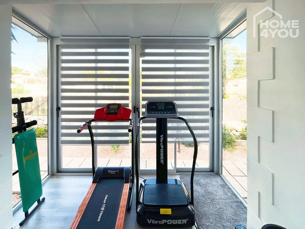 Im Inneren erwartet Sie ein geräumiges Wohnzimmer, ein Schlafzimmer mit Doppelbett sowie ein verglaster Bereich, der derzeit als Fitnessraum genutzt wird und eine voll ausgestattete Küche. Eine überdachte Terrasse wird im Sommer als Essbereich genutzt und führt zu einer Treppe, die in den großzügigen Garten führt.