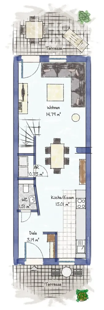 Das 40 qm große EG verfügt über einen offenen Koch-, Wohn-/Essbereich, einer Diele, einem Handwerksraum sowie einem Gäste-WC.