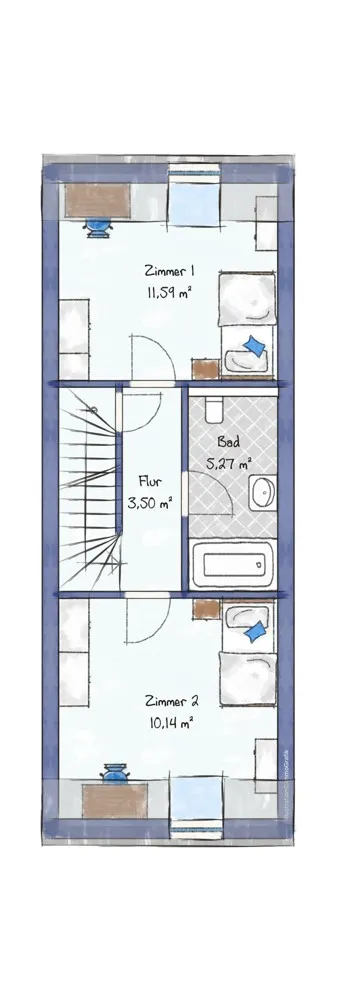 Das 30 qm große OG umfasst 2 Schlafräume, einen Flur und ein modernes Badezimmer mit Fenster.