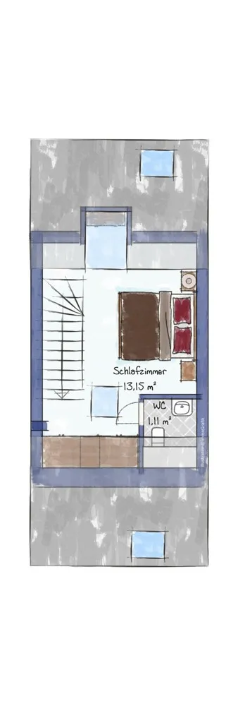 Das 14 qm große DG umfasst einen weiteren Schlafraum sowie einem WC.