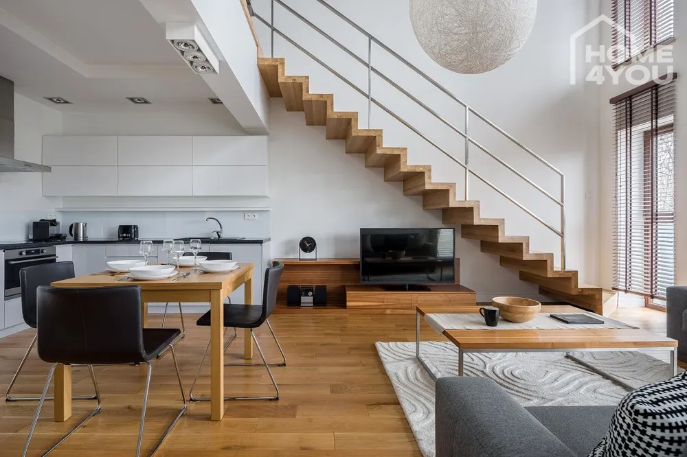 Die alte Bausubstanz wird bei unseren Objekten gekonnt mit industriell wirkenden Trägern und konstruktivistischen Stahl-Glaselementen verbunden – dazwischen Akzente aus filigranem, satiniertem Edelstahl. Transparente Wände und begehbare Deckenelemente aus Glas sowie Lichthöfe schaffen ein luftiges Raumgefühl, während Holzböden in warmen Naturtönen erden.