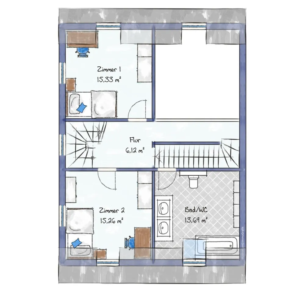 Das 50 qm große OG umfasst 2 Schlafräume, einen Flur und ein modernes Badezimmer mit Fenster.